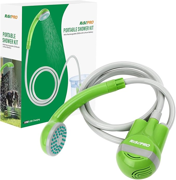 Portable Camping Shower, Outdoor Shower Head, Shower Pump, Rechargeable Battery, USB Charging Line, Pumps Water from Bucket, for Hiking, Pet Cleaning and Shower, Car Washing