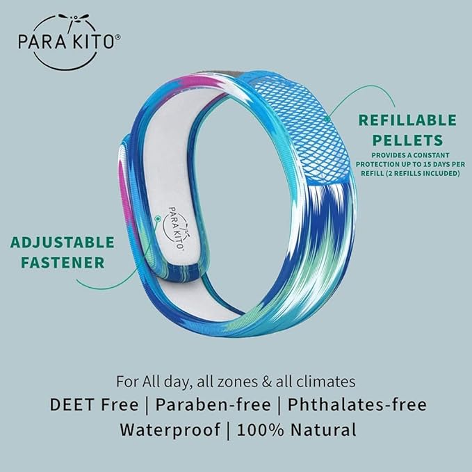 - WATERPROOF & REFILLABLE: All day, all zones, all climates! Whether you are strolling through a forest or snoozing on a tanning bed, PARA’KITO wristbands provide constant protection for 15 days per refillable pellet (2 pellets Included).