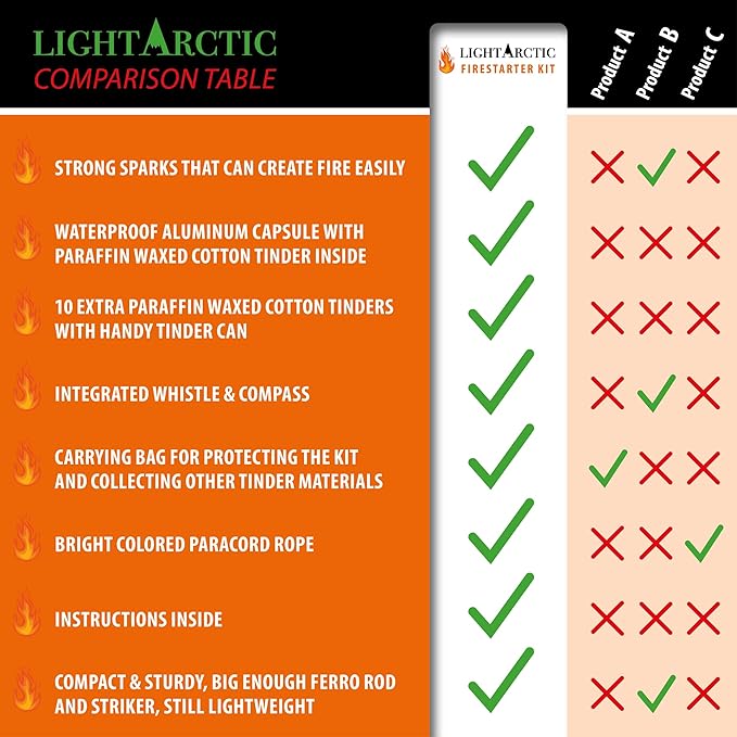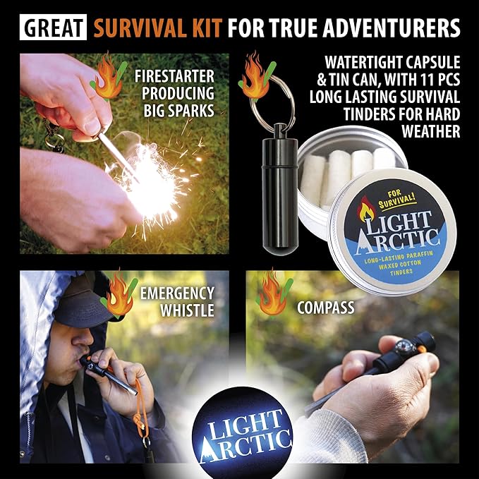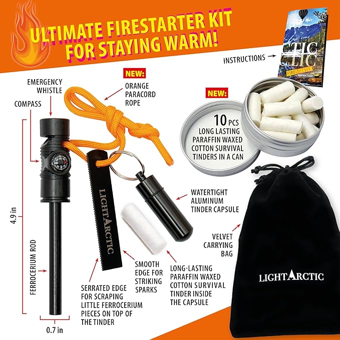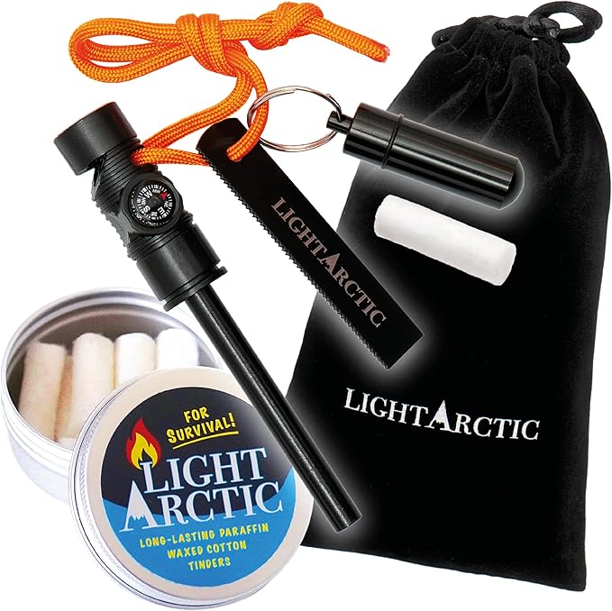 Ferro Rod Fire Starter Kit Survival Gear by LightArctic: 7-in-1 Flint and Steel Includes Compass, Whistle, 11 pcs Waxed Tinders with Waterproof Capsule - Tested in The Most Extreme Weather Conditions