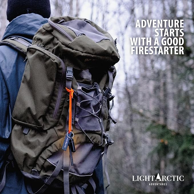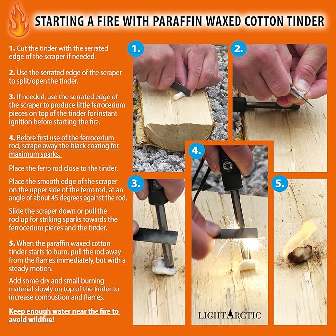 - IGNITES QUICKLY, BURNS STRONGLY, LASTS LONG: LightArctic's Ferro rod striker includes eleven paraffin-waxed cotton tinders. These come stored in a sturdy waterproof aluminum capsule and a tinder can, burning for up to four minutes at a time - even with gusting winds!