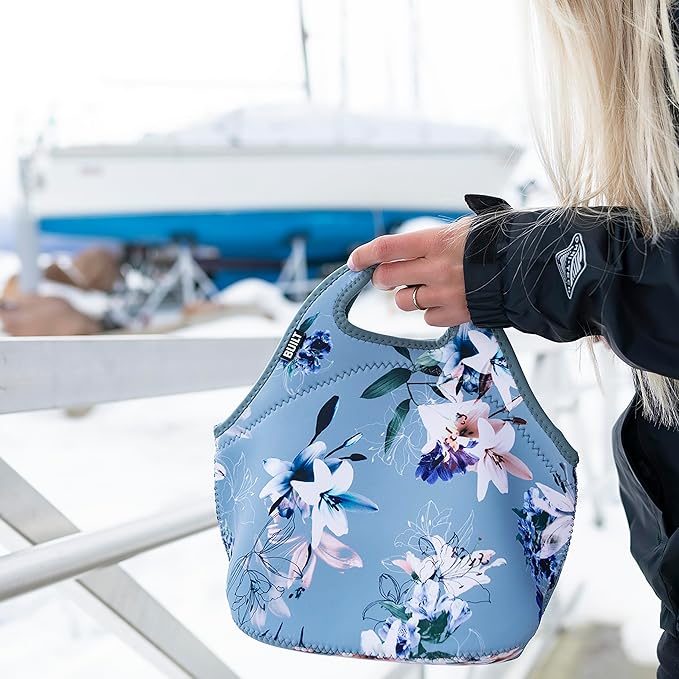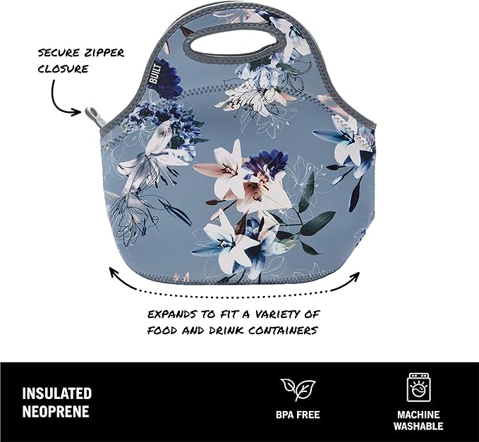 Built Gourmet Getaway Neoprene Lunch Bag - Insulated, Reusable, & Machine-Washable Lunch Tote for Hot and Cold Food Storage, Lightweight & Reusable - One Size (Pewter Lily)