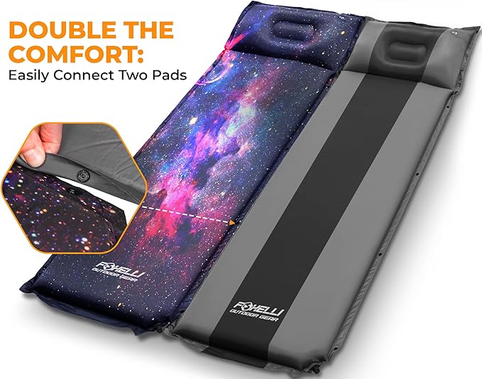 - QUICK + EASY AUTO INFLATION – No pump or equipment is needed to set up your pad. Simply twist the valve open, unroll the foam sleeping pad and it will inflate all by itself! For firmer support, add a few puffs to sleep pad and you’ll have a pad so comfy and inviting, you’ll forget you’re not in your own bed. For a softer surface, gently squeeze out a little air. Pillow can be inflated separately. Wake up ready to explore the great outdoors, while being well-rested with Foxelli sleeping bag pad!