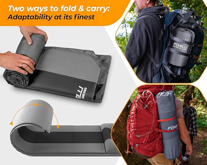 Foxelli Self Inflating Sleeping Pad for Camping, Backpacking, Hiking, Insulated Foam Lightweight Camping Mat, Inflatable Camp Mattress with Pillow