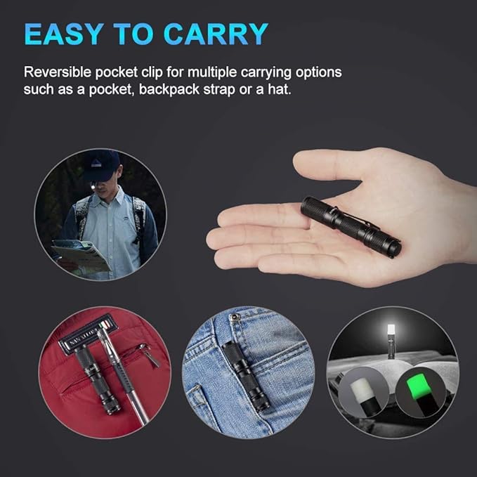 - [Perfect in size] Low weight, clips just inside your pocket and will barely know it's there,with no rough edges to carry in delicate dress or athletic wear clothing. Super easy single hand operation. The clip can be reversed easily allowing improvised headlamp use with a hat.