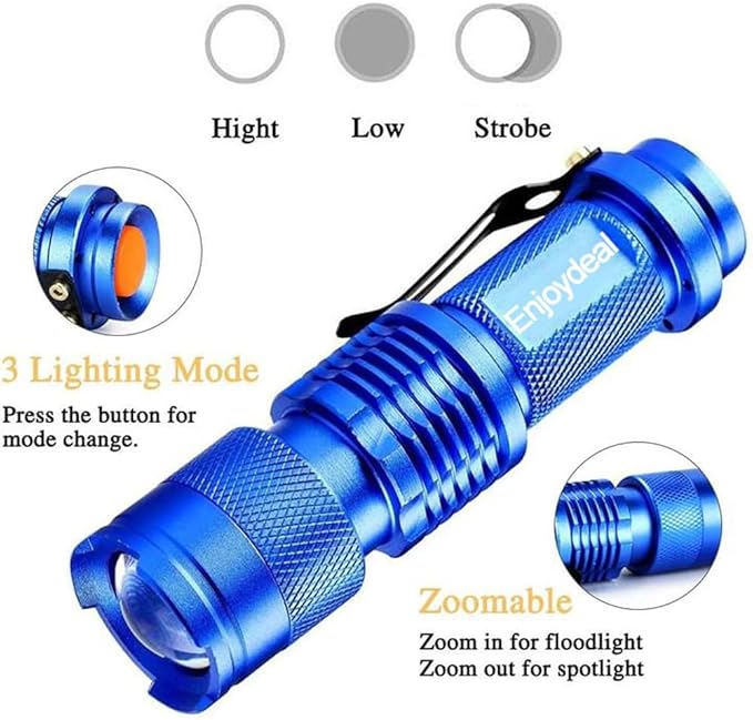 - mini LED flashlight torch Output adjustable focus range for different usage,stretch to adjust its focus support zoom in-out,3 Mode Flashlight Torch: High/ Low/ Strobe, soft-touch tail cap switch allows for on/off mode and switching between 3 light modes