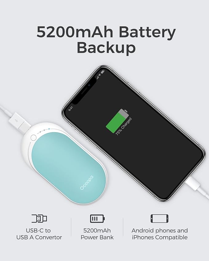 - Long-Lasting Battery: With a 5200mAh lithium rechargeable battery and USB-C charging port, you can use your hand warmer for hours and even charge your electronic devices on the go.