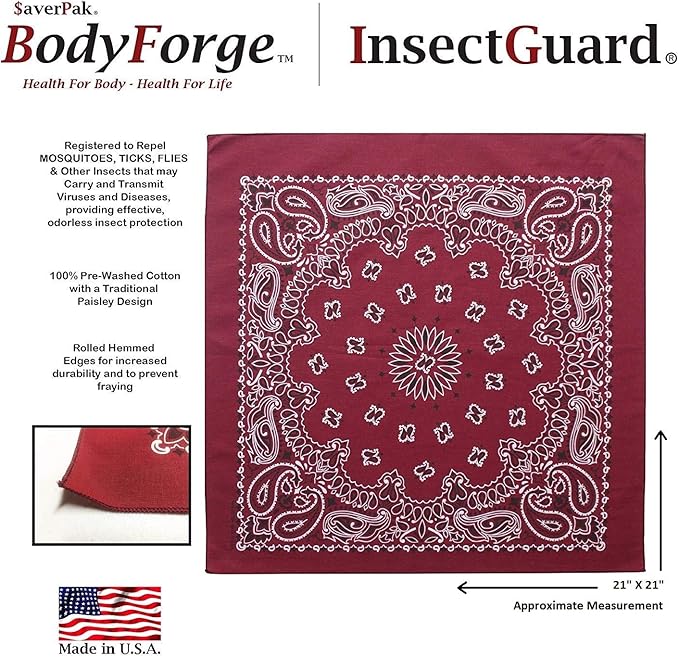 • InsectGuard BodyForge Bandannas are approximately 21”x21” in size. INSECT REPELLENT: InsectGuard products come pretreated with a powerful microencapsulated permethrin insect repellent (Skintex MRIII) and is Registered to repel mosquitoes, ticks, ants, flies, chiggers and/or midges. The treatment process provides a KNOCKDEAD effect for insects when they come in contact with it and provides effective, odorless insect protection Registered to last to 50 washes.