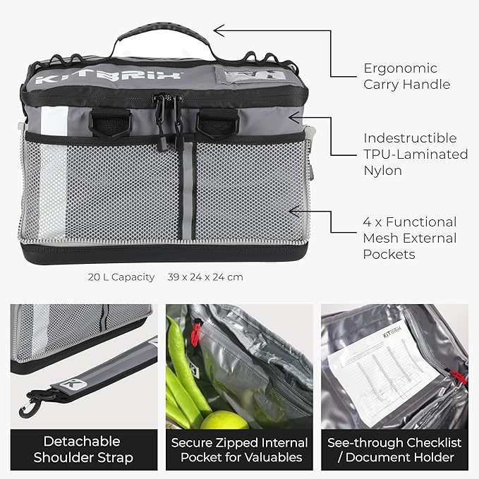 - USE AS HAND LUGGAGE! SECURE & SUITABLE FOR TRAVEL - The Kitbrix waterproof bag comes with fully lockable zips to keep your expensive kit and valuables safe. Can be used as a cabin bag / carry-on hand luggage for most airlines. Measures: 15.3 x 9.4 x 9.4 Inches. Weight: 3.1lbs. Capacity: 20 L