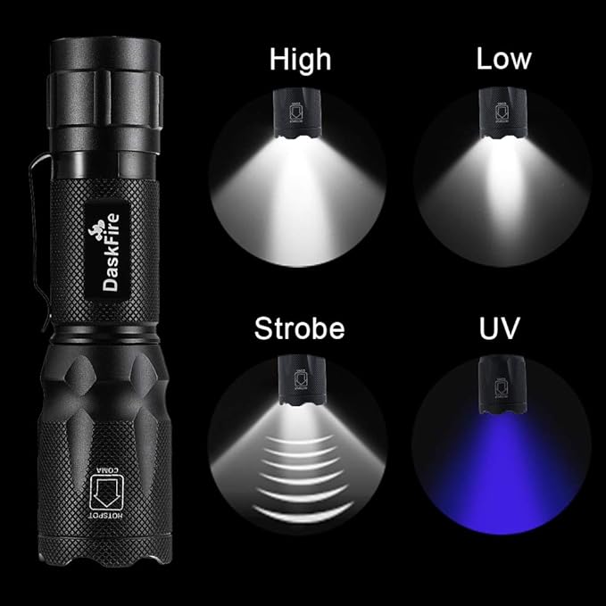 - 2 IN 1 BLACK LIGHT FLASHLIGHT ☼ Besides white light, DaskFire mutifunction ultraviolet flashlight delivers focused beam of 395nm blacklight that is more powerful than the ubiquitous cheap pet urine detector light. Also, it does beautiful job to highlight the automotive AC UV tracer/uv dye, hunting scorpion, uv body art, test fluescent in diapper/face mask, check ore, match use with uv resin glue, etc