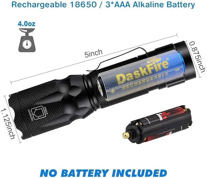 - RECHARGEABLE BATTERY LED FLASHLIGHT ☼ It works more environmental friendly with a rechargeable 18650 battery. If there is short of 18650 temporary, instead of 3 AAA alkaline battery with AAA adapter directly ( Not Included 18650 or AAA )