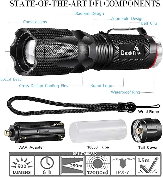 - ULTRA BRIGHT LED FLASHLIGHT EASY TO USE ☼ Based on different light needs, the led beam is zoomable by pull in or pull out. With half press or gental press rear button, 4 light modes runs in sequence of High-Low-SOS-UV lights. Full press can On/Off DaskFire DF1 flashlight