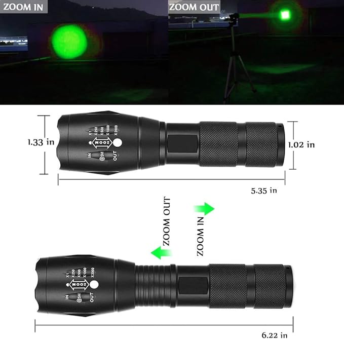 - ZOOMABLE: Adjustable focus range for different usage, support zoom in-out. The long range green beam can reach up to 350 Yards.