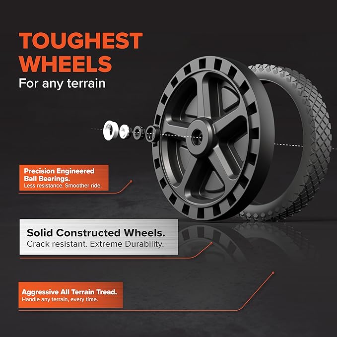 - Effortless Design: Haul your waste with ease with no-flat wheels built for any terrain, an oversized handle for easy maneuvering, & a steel tow adapter for effortless towing behind a truck or golf cart