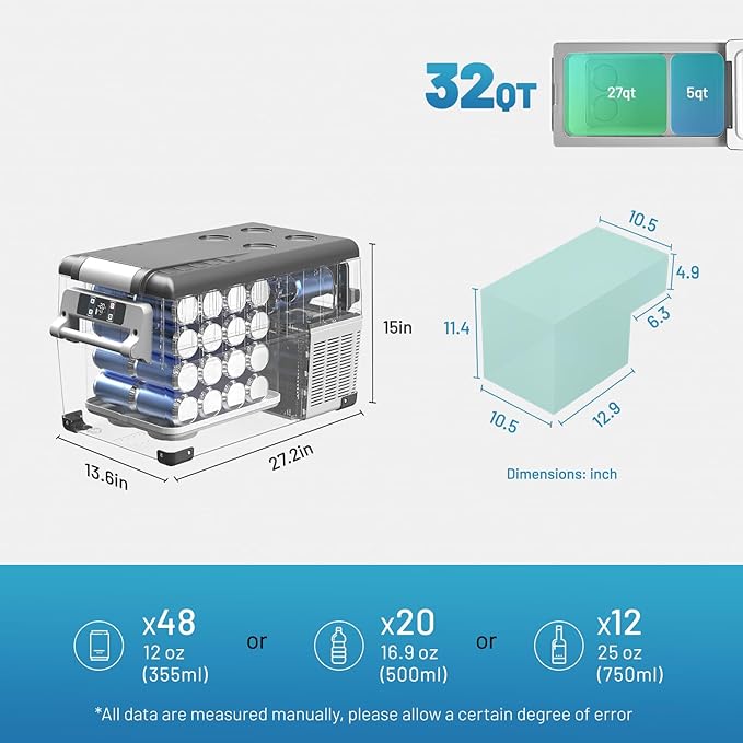 - STORAGE SPACE:Exterior Size 27.2”x13.6”x15”, 32Quart(30.6 Liter) capacity ,fits 48 x 12ozs cans of Cola.