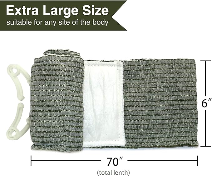 - 6 inch wide and 70 inch long, 3-layer dressing pad, for traumatic hemorrhagic injury