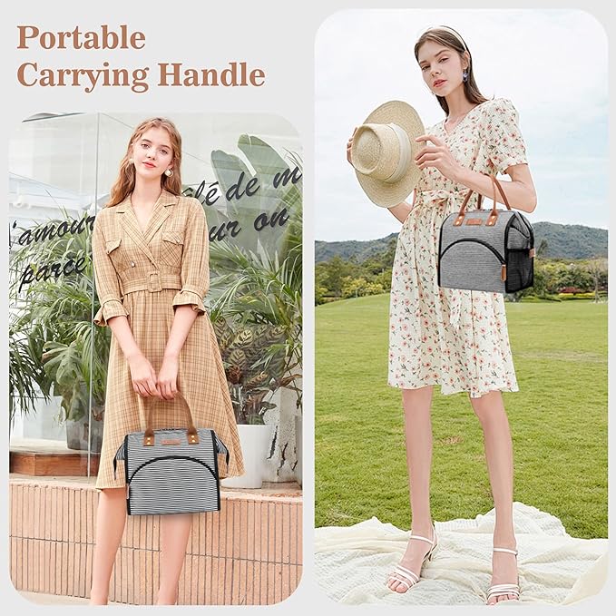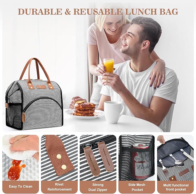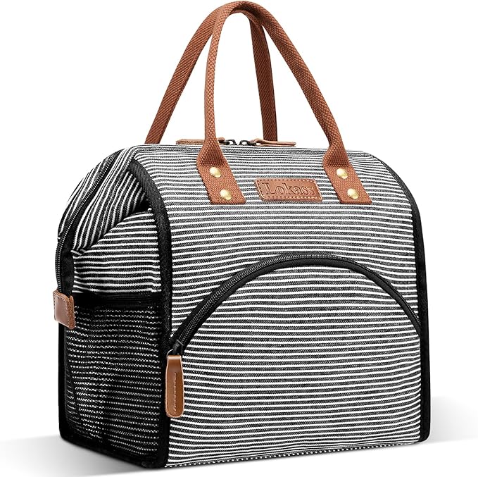 LOKASS Lunch Bag Insulated Lunch Box Wide-Open Lunch Tote Bag Large Drinks Holder Durable Canvas Thermal Snack Organizer for Women Men Adults Work Picnic Hiking Beach Fishing,Stripes