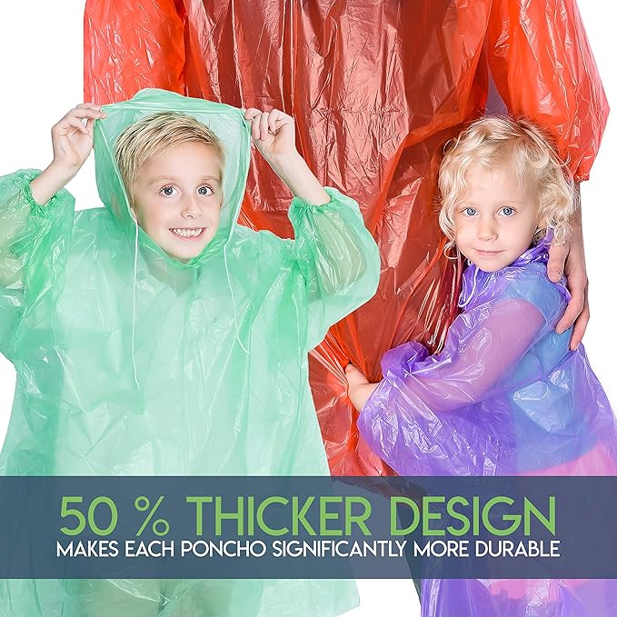 - BUILT FOR THE HARSH WEATHER: We’ve designed our rain ponchos with durable and thicker, 0.03mm PE waterproof material – Perfect for the family on a wet, rainy day! We have confidence in the quality of our rain ponchos, stay dry for your special events with our unbeatable quality standards.