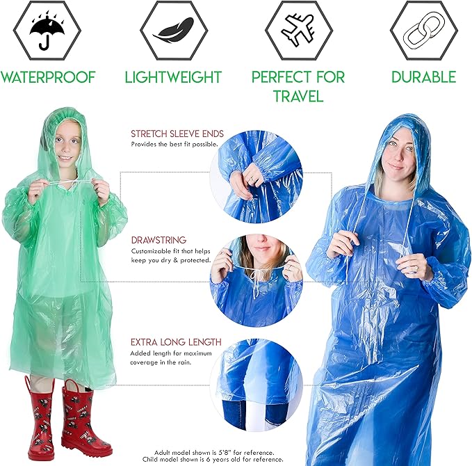 - EXTRA-SECURE FIT: No details are left out – Be sure to stay dry with your poncho with an adjustable drawstring hood and elastic sleeves that create an airtight fit to make sure rain stays out! These raincoat jackets come individually wrapped in their own featherweight plastic bags that can be easily thrown in your backpack when heading out for activities such as traveling, hiking, cycling, camping and more!