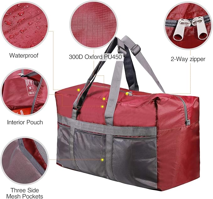 - POCKETS: The REDCAMP extra large duffel bag is equipped with four outside pockets with 3 open mesh pockets on one side and a zippered pocket on the other side. It also has an interior pocket that the duffel bag folds into when not in use. There is also a special suitcase sleeve to conveniently carry the bag on top of your rolling suitcase