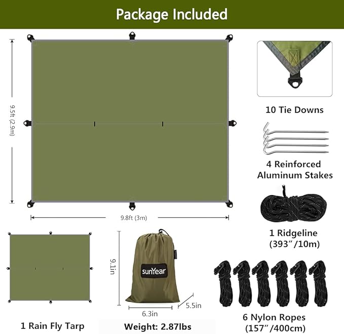 - Included Components : 4 x Aluminum Tent Stakes (lightweight and sturdy), 1 x Sunyear Rain Fly Tent Tarp (Best for most hammocks on the market), 1 x Small Accessory Stuff Sack, 1x10 Meter Guy Lines + 6x4 Meter Guy Lines, 1 x Rain Fly Tent Tarp Stuff Sack 4 x Aluminum Tent Stakes (lightweight and sturdy), 1 x Sunyear Rain Fly Tent Tarp (Best for most hammocks on the market), 1 x Small Accessory Stuff Sack, 1x10 Meter Guy Li… See more