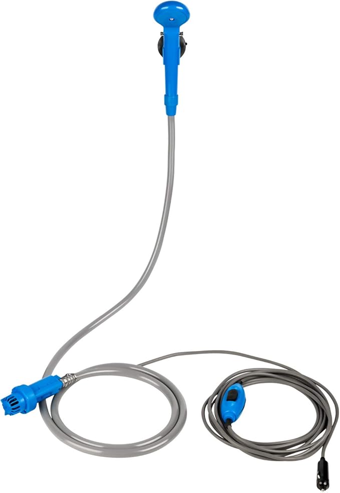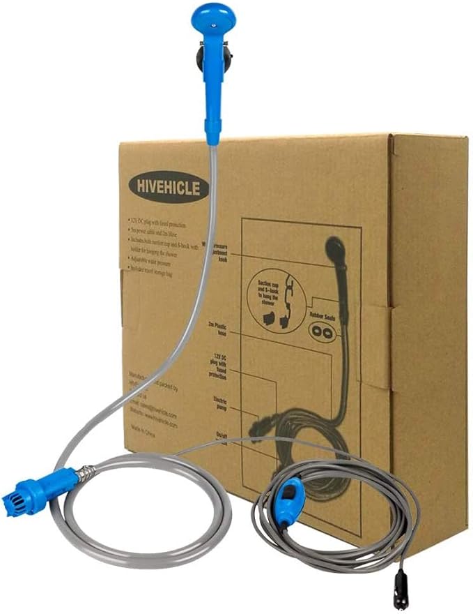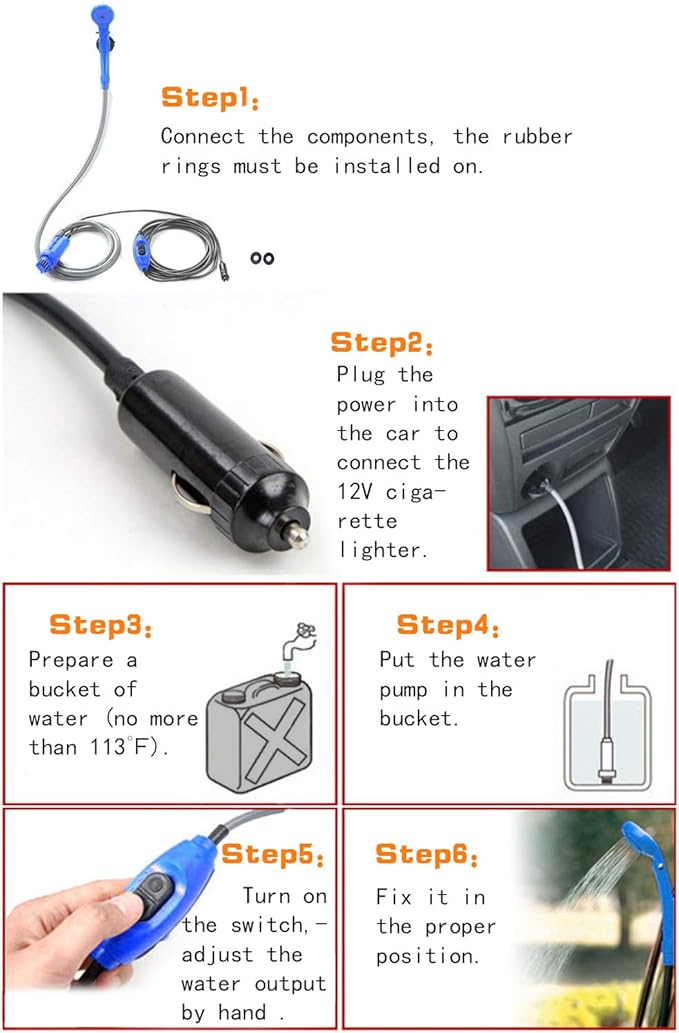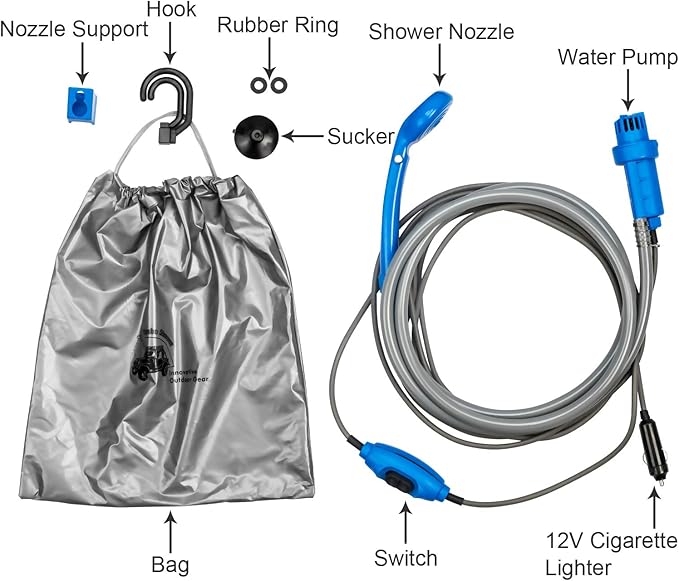 - 2.Portable design-- Light weight, small volume, all the shower parts can be put into a complimentary durable bag for easy packing. Fits for any 12V car cigarette socket, you can take a shower anytime and anywhere. It's a good choice to take it with camping, outdoor sports, backpacking, music festivals.