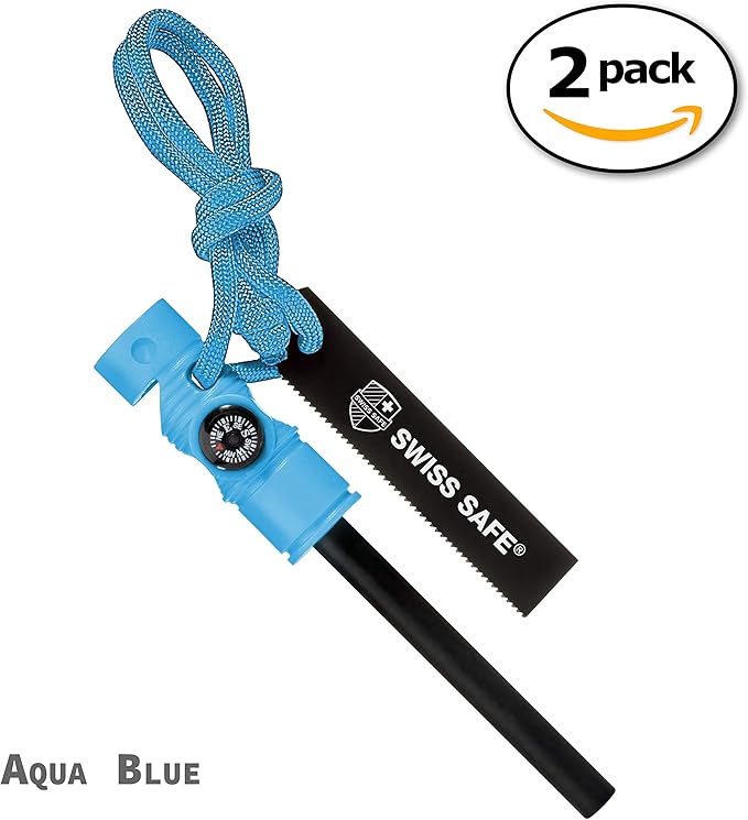 Swiss Safe 5-in-1 Fire Starter with Compass, Paracord and Whistle (2-Pack) for Emergency Survival Kits, Camping, Hiking, All-Weather Magnesium Ferro Rod