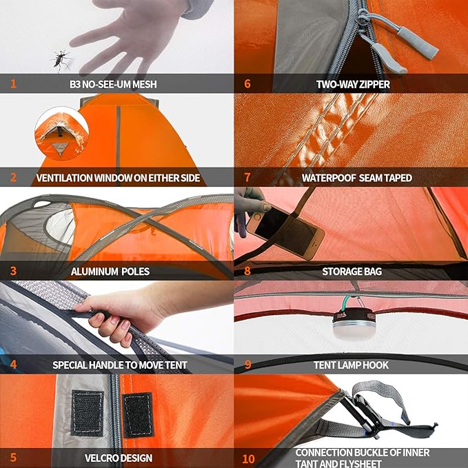 - 【Breathable & Stable】: Large section of mesh and 2 D-shaped doors with dual zippers provide much better ventilation. Equipped with 10 lightweight Alloy Pegs and 2 Wind ropes, the tent has a high resistance of wind.