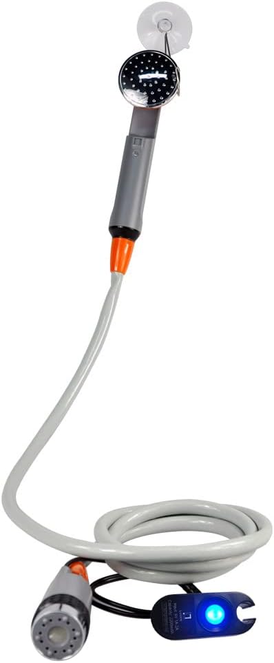 - ▶COMPACT CAMP SHOWER -the kit consists of a powerful shower pump, a delicate shower head, a suction cap, a S-hook and the 1.8M hose and a rechargable battery, which ensures its mobility and flexibility while using