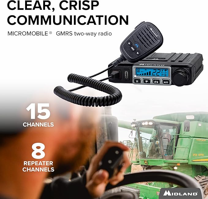 - FARM TRACTOR BUNDLE: Expand your communication range on the farm with 15-Watts of GMRS power in your vehicle or base station with Midland’s MXT115AGVP3 MicroMobile Farm Tractor Bundle. The bundle includes Midland’s MXT115 MicroMobile, MXTA13 6 Inch 2.1 dB antenna, antenna cable, and mounting bracket. The MXT115AGVP3 mounts in most vehicles and communicates with all Midland FRS/GMRS radios, has all 8 repeater GMRS channels