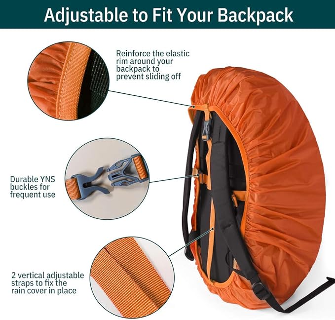 • Adjustable to Cover Your Backpack : Unigear rain cover features 2 vertical anti-slip buckle straps to adjust different backpack and pull the pack cover tight across the pack harness. Reinforce the elastic rim around your backpack to prevent sliding off. Comes in 5 sizes and colors to fit from 10L to 90L backpack
