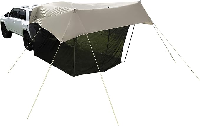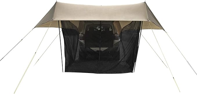 - FEATURES: Tarp with integrated/convertible mesh sidewalls provides vehicle based shelter for hunting, camping & off-road adventures. Unique attachment system easily connects to most Jeeps, SUV's or trucks. Dual pole "awning" set up with vehicle.