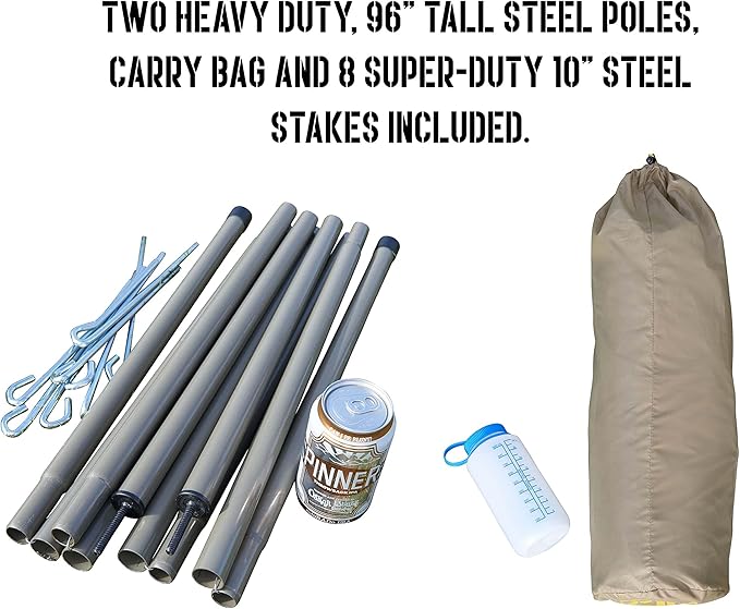 - INCLUDES: Two heavy duty, 96" tall steel poles, heavy duty reflective guylines, carry bag and 8 super-duty 10" steel stakes.
