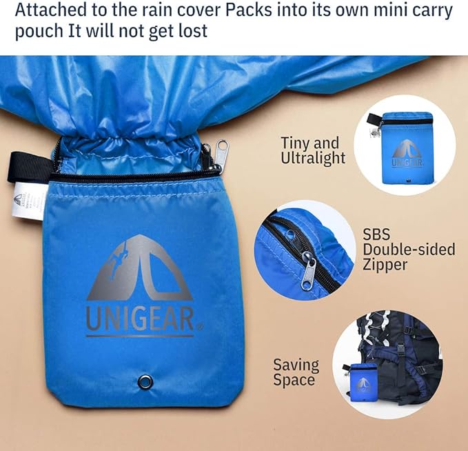 • Packs into Its Own Mini Carry Pouch : Unigear backpack cover is ultraportable, tiny and saving space. Designed with double-sided zipper, it can be packed down into its own nylon pouch which attached to the pack cover. Don’t worry about losing the carry pouch again