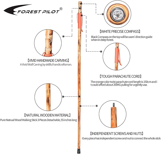 - 【NATURAL WOODEN MATERIAL】 - Pure Natrual Cedarwood Walking Stick 3 Pieces Detachable, 55 inches long.