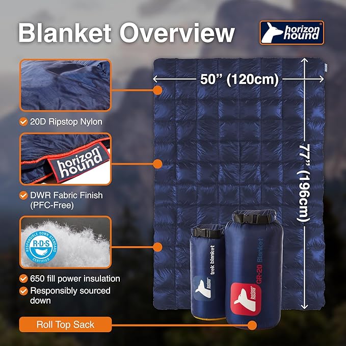 Horizon Hound Down Camping Blanket - Outdoor Travel Quilt | Sustainable, Insulated, Lightweight & Warm Gear for Sleep, Camping, Stadium, Hiking & Festivals | Water Resistant, Packable & Compact
