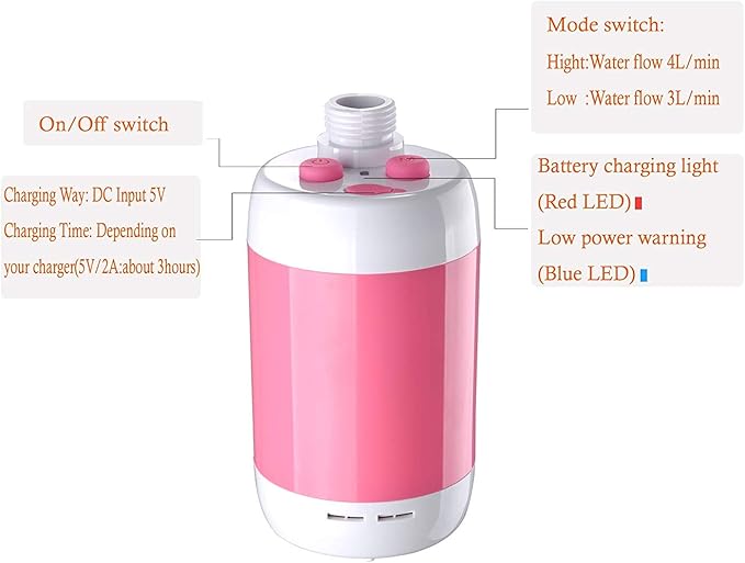• 【Humanized Designed Shower】 The electric shower is designed with low battery warning light and charge indicator light. The portable electric shower through IPX7 ROHS FCC certification, safe and reliable