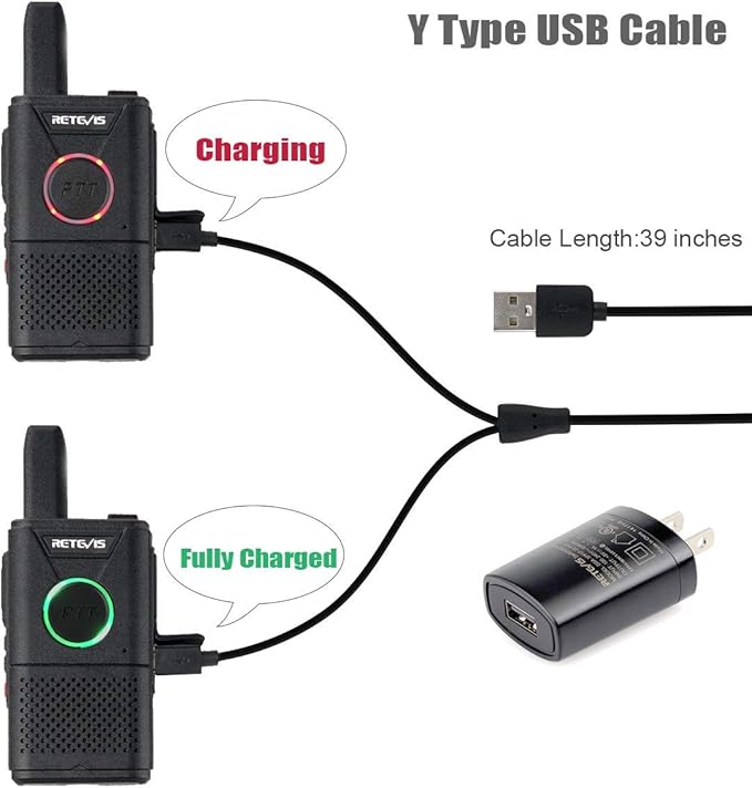 - AC charging adapter with two USB connectors on a Y cable;you can charge two walkie talkies at the same time; 1000 mAh lithium ion battery provides 10-12 hours of frequent use on a single charge