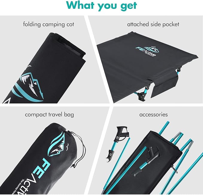 - FEATURES: With your cot, you'll also receive an attached side pocket where you can put your items, replacing a camping table. Additionally, you'll receive a travel bag that allows this portable bed to fit snug in any backpack