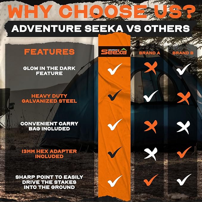 - STRONG AND SECURE - The Adventure Seeka Drillable Tent Stakes are designed for extra strength in windy conditions and are suitable for use in grass, dirt, harder soils and sand.