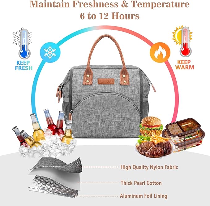 - [Superior Thermal Insulation] Designed with a durable aluminum foil lining and thick insulation, this lunch bag women keeps your food warm or cold for up to 8 hours. The food-safe, non-toxic material won’t melt when storing hot meals and is easy to wipe clean.