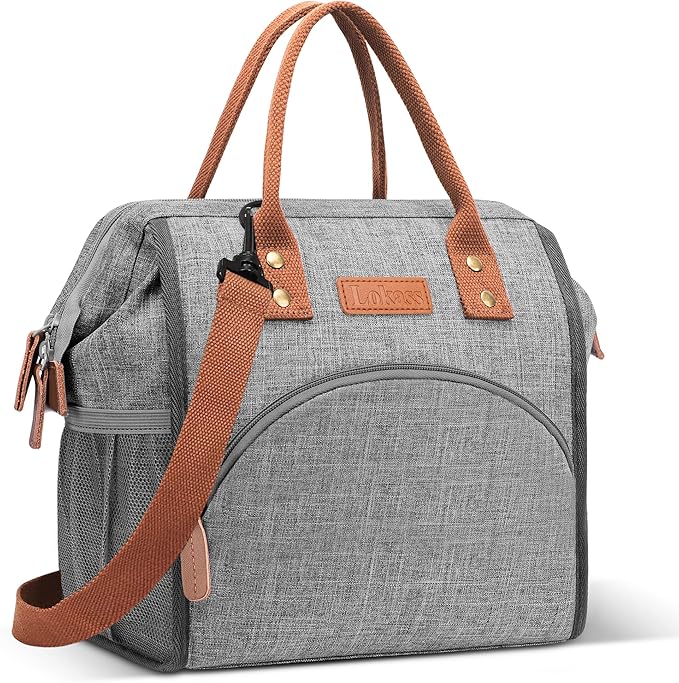 LOKASS Lunch Bag Insulated Lunch Box Wide-Open Lunch Tote Bag Large Drinks Holder Durable Nylon Snacks Organizer with Removable Shoulder Strap for Women Men Adults Work Outdoor,Grey