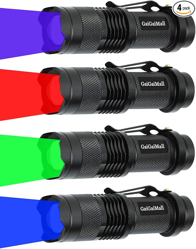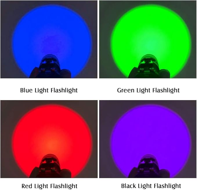 - PACKAGE INCLUDED: 1 × Red Light Flashlight, 1× Green Light Flashlight, 1× Blue Light Flashlight, 1× BlackLight Flashlight