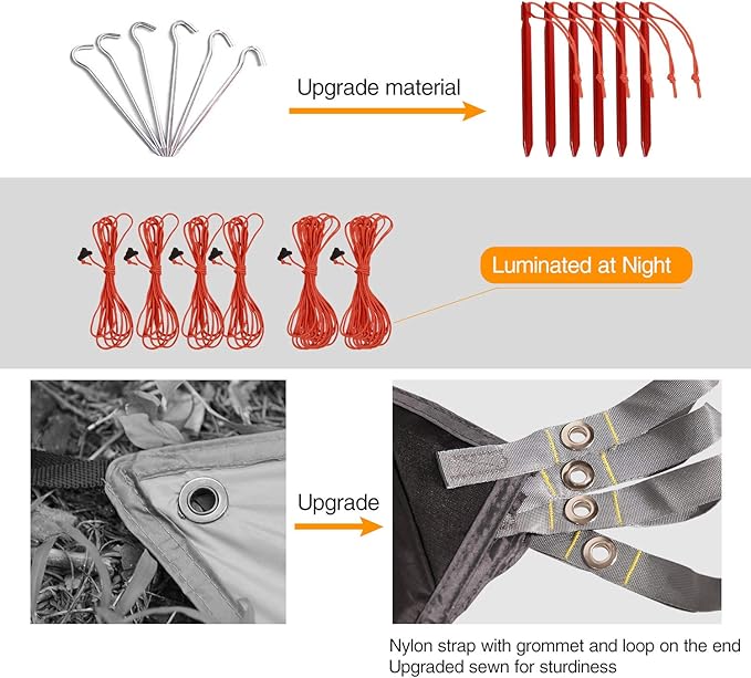 - LIGHTWEIGHT: The large tent tarp has 6*aluminum stakes, 6*wind ropes, just weight 2lbs/0.9kg. Open size is 118"x141.7"/300cmx360cm