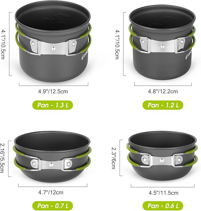 - Best Money Ever Spent: The 16 pieces camping cookware kit includes 2 non-stick pots(1.2L&1.3L) + 2 non-stick pans(0.6L&0.7L) +1 mini stove (with storage case) +2 mugs + 2 spoons + 2 forks + 2 knives + 2 cleaning clothes + 1 Carry bag.