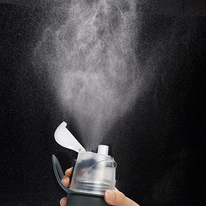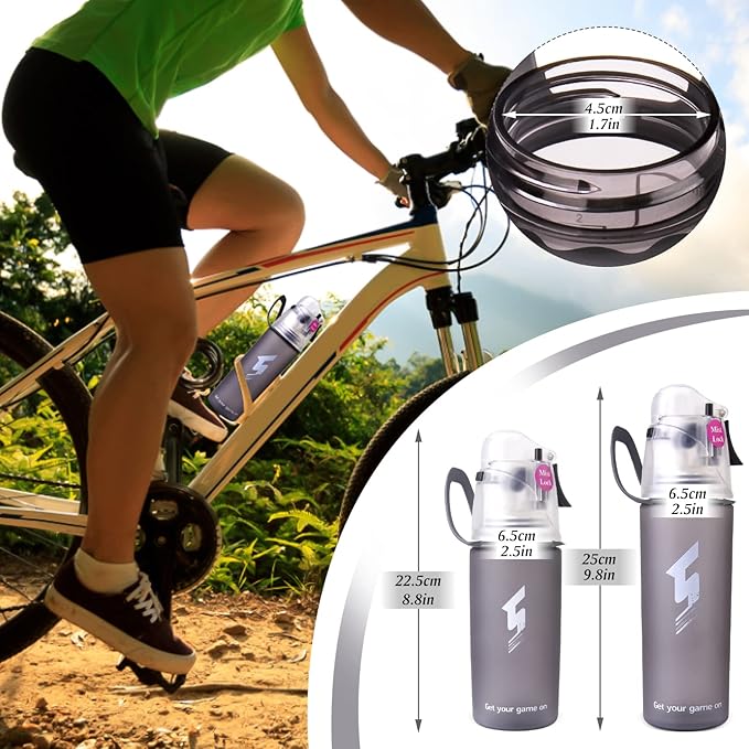 - PREMIUM QUALITY DESIGN AND EASY TO USE: Our Misting Sports Bottle is stylish and convenient to use. The special spill-proof top swings open with a One-Click push of a button! An air hole placed on the lid ensures fast flow of water with effortless drinking. It is ergonomically shaped to make one-handed use, with a portable PE handle and PP drink cap which protect the water from the dust and dirt.