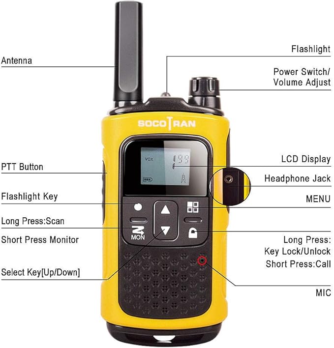 - ✔ VOX and Keyboard Lock Function - You can send your voice and talk with kids or friends without pressing PTT while voice-activated. No worries about the kids will change the channel by accident. the channel locking feature will keep them on the right channel