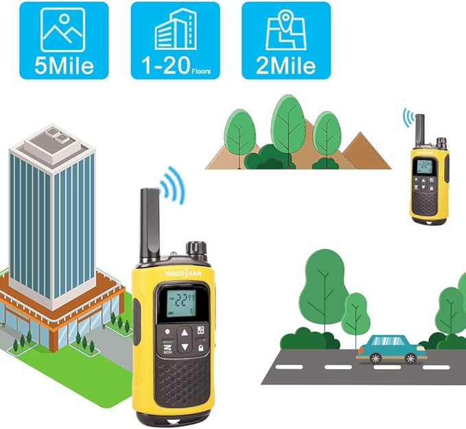 - ✔ Walkie Talkies for Adults Long Range - Warm Note: Actual range will vary depending on terrain and conditions. The ideal range is up to 5 miles. There is even a flashlight on rechargeable walkie talkie to help to look for something or try to get the attention of someone in the dark