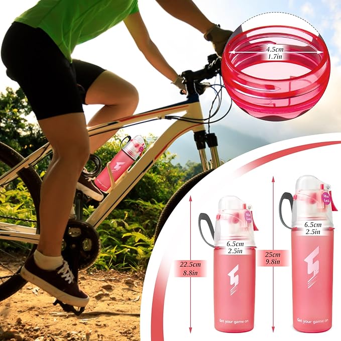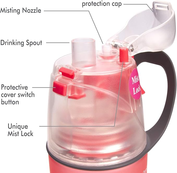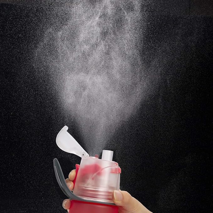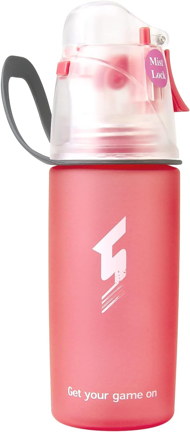 - PREMIUM QUALITY DESIGN AND EASY TO USE: Our Misting Sports Bottle is stylish and convenient to use. The special spill-proof top swings open with a One-Click push of a button! An air hole placed on the lid ensures fast flow of water with effortless drinking. It is ergonomically shaped to make one-handed use, with a portable PE handle and PP drink cap which protect the water from the dust and dirt.