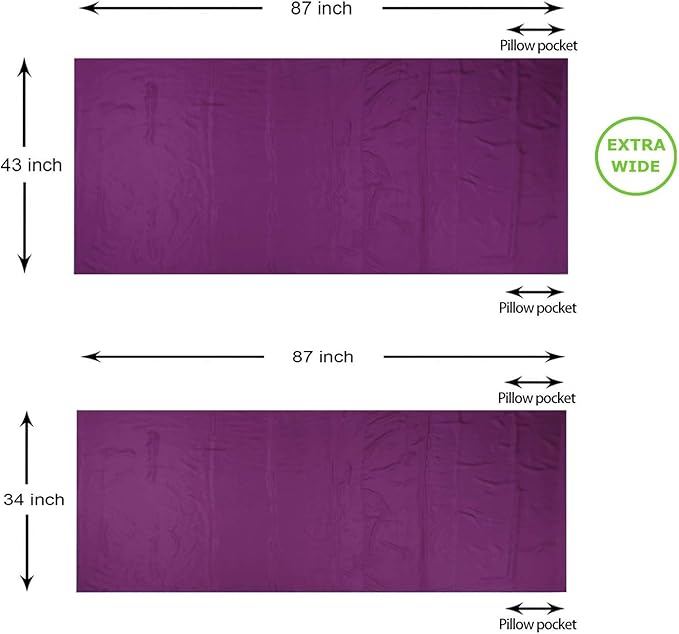- EXTRA WIDE AND SUPER LIGHTWEIGHT: Two sizes for option: 87”x43” is an extra wide size, which is about 9” wider than a normal single liner. There’s generous space for the tall people to move freely. It weighs only 6.3oz. (180g); The 87"x34" liner weights 5oz. (140g), which is a comfortable size for one person. The liner is compacted in a tiny ripstop nylon stuff bag. With an attached hook on the carry case, you can link it up with the liner after taking the liner out, avoid losing the stuff bag.