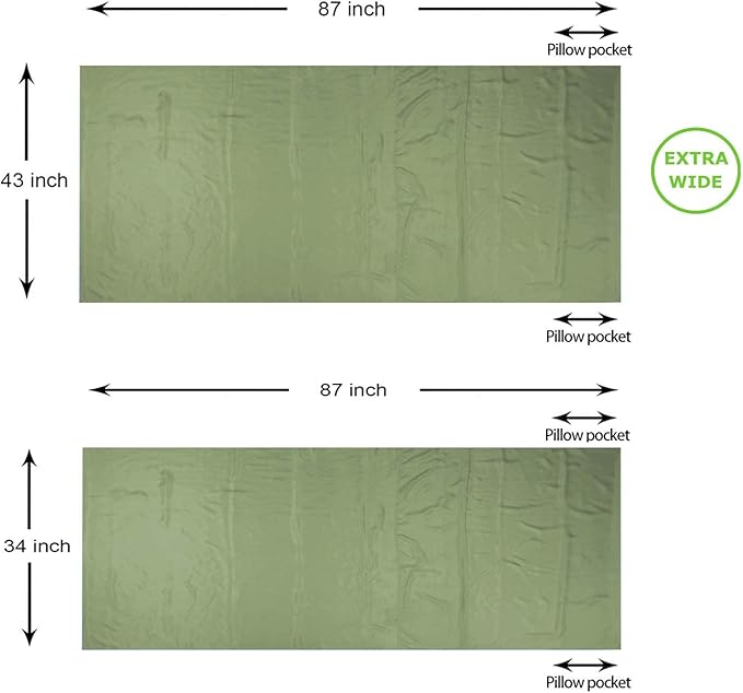 - EXTRA WIDE AND SUPER LIGHTWEIGHT: Two sizes for option: 87”x43” is an extra wide size, which is about 9” wider than a normal single liner. There’s generous space for the tall people to move freely. It weighs only 6.3oz. (180g); The 87"x34" liner weights 5oz. (140g), which is a comfortable size for one person. The liner is compacted in a tiny ripstop nylon stuff bag. With an attached hook on the carry case, you can link it up with the liner after taking the liner out, avoid losing the stuff bag.